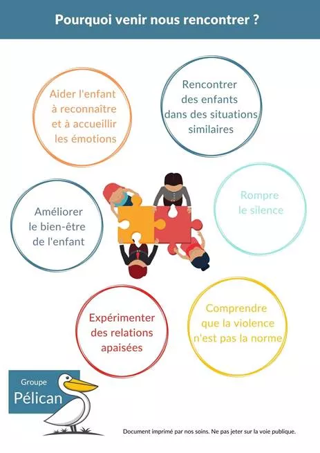 Porté par l’association ROSACE, et plus spécifiquement le Centre Maternel Le Renouveau, le Groupe Pélican est un groupe d’écoute et de soutien pour les enfants exposés aux violences conjugales.