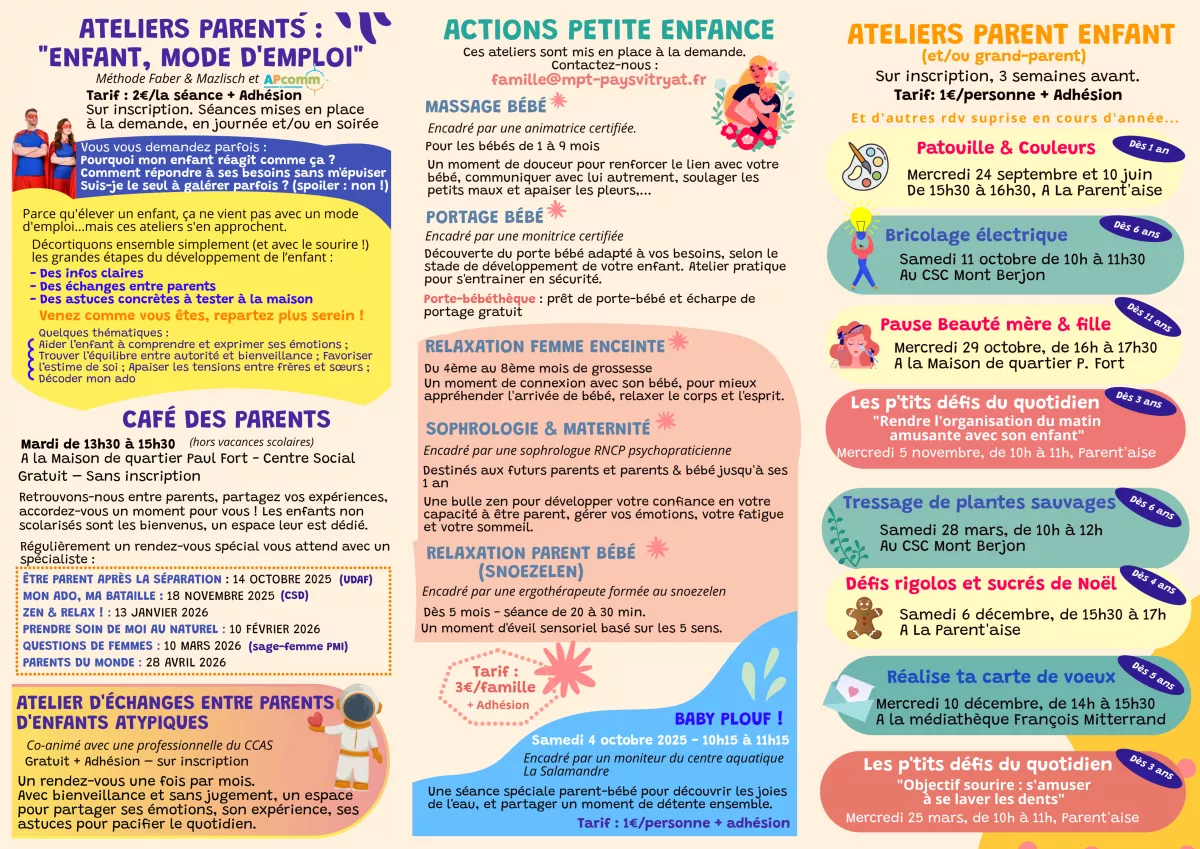Notre objectif ? Créer avec vous des moments qui vous ressemblent, répondre à vos envies du quotidien et accompagner vos besoins de parents. N’hésitez pas à découvrir tout ce que nous avons préparé pour vous… et à nous partager vos idées pour imaginer ensemble de nouvelles activités !